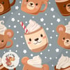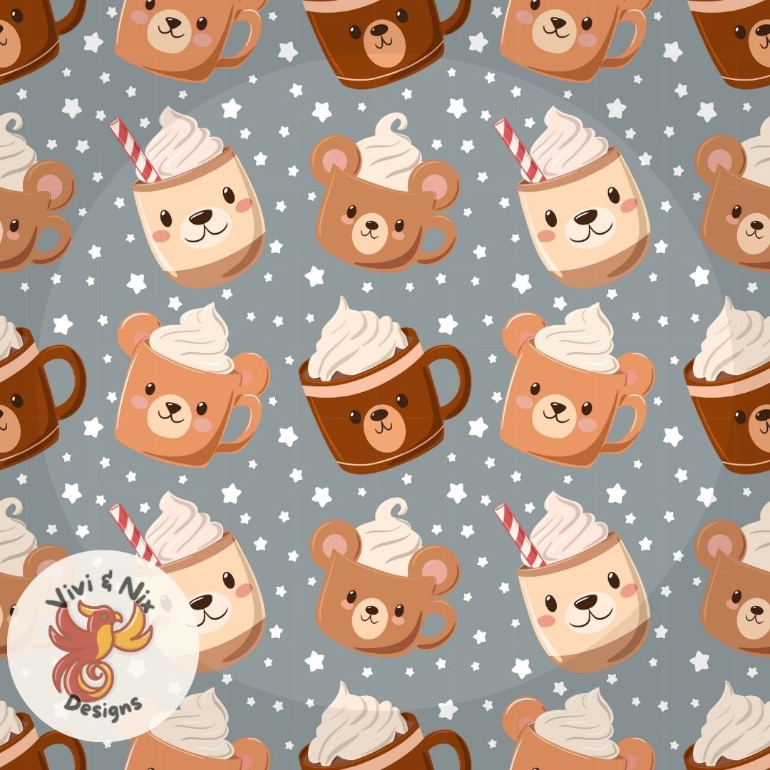 A cozy seamless pattern featuring adorable bear mugs filled with hot cocoa and whipped cream, scattered with tiny stars on a soft gray background.
