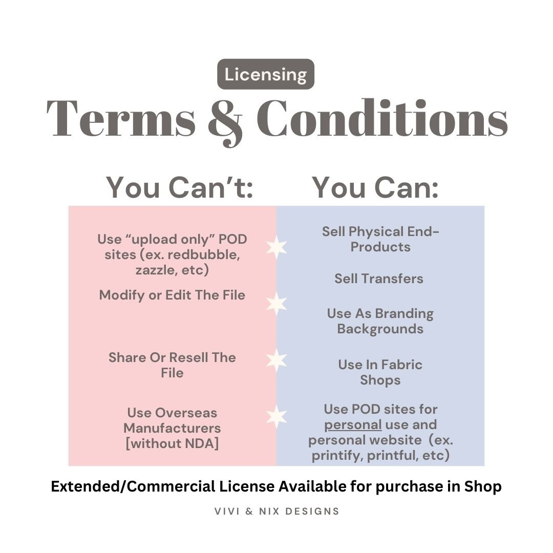 ❌ Not allowed: redistributing the seamless tile, reselling the file as-is, uploading it to POD sites as standalone artwork, or including the tile in any freebie, kit, or design pack.