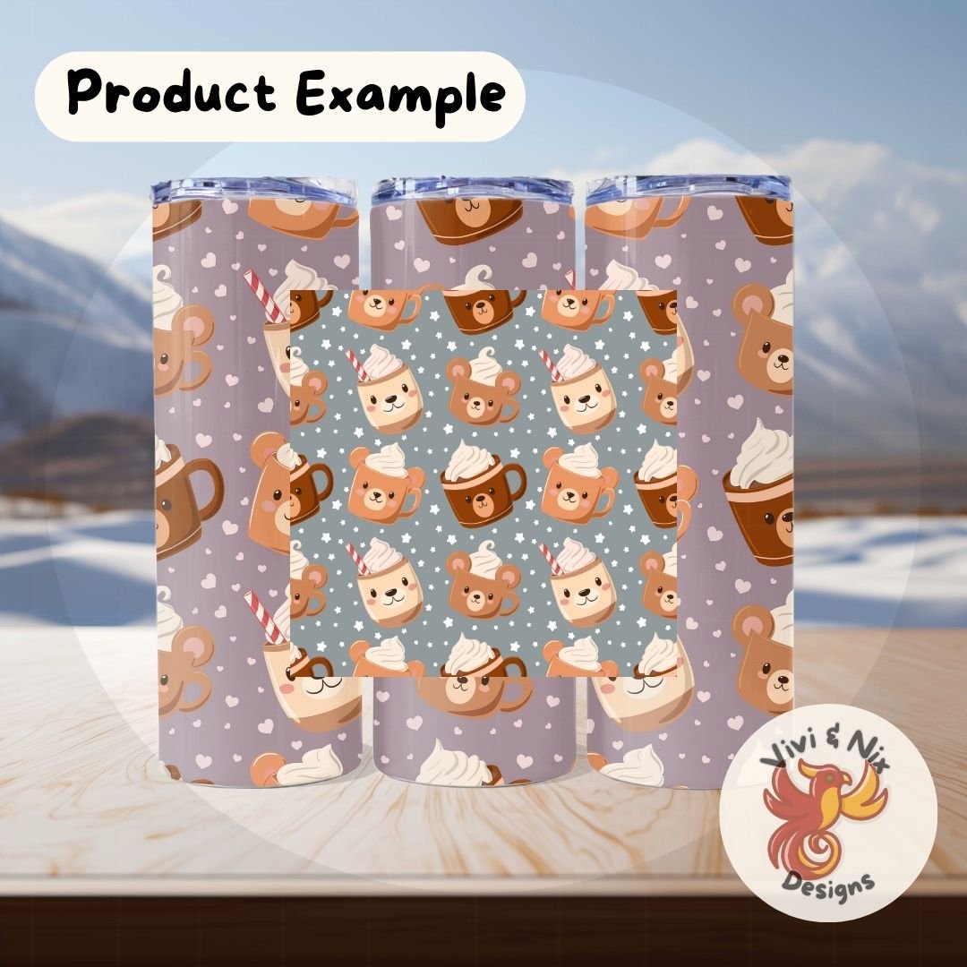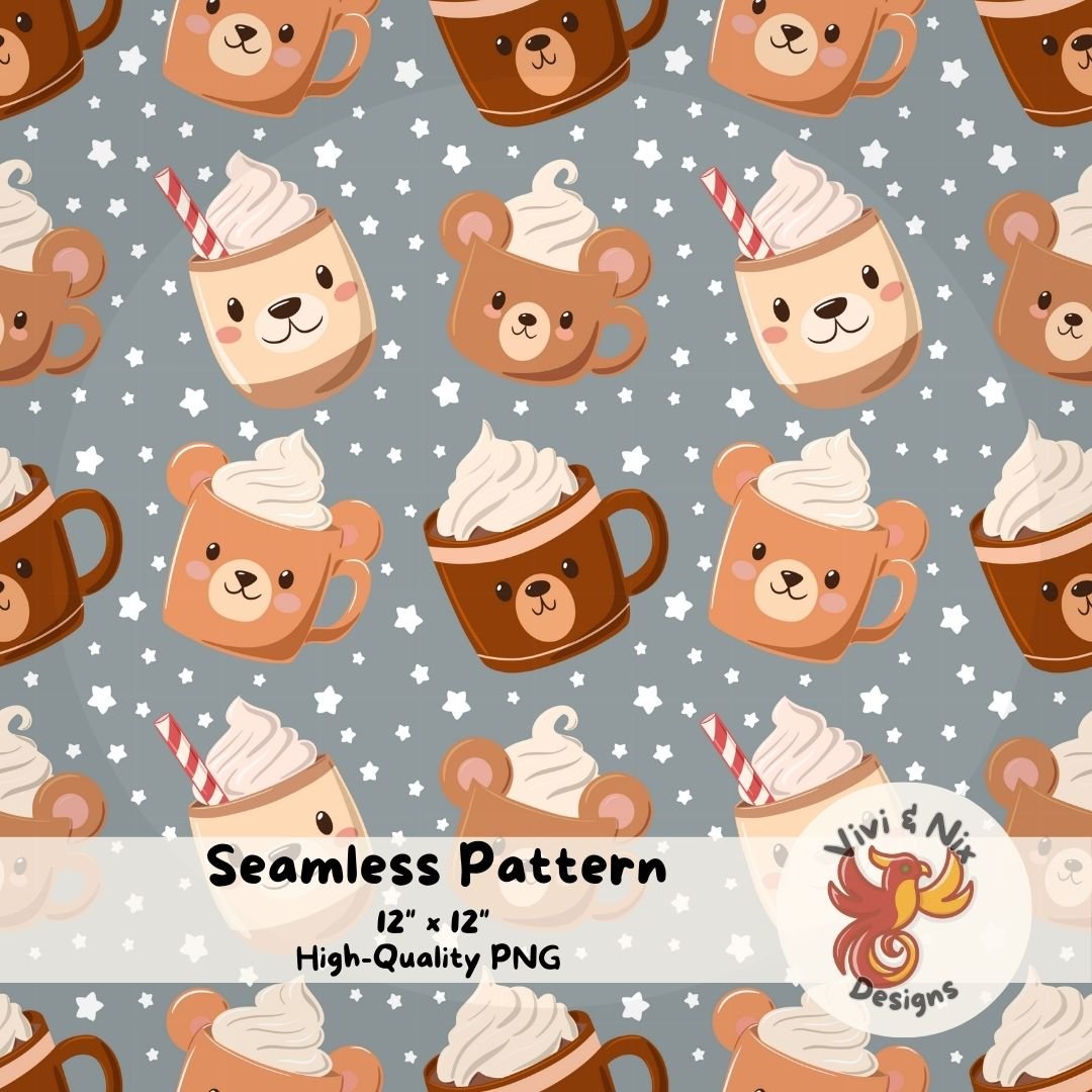 This Bear Cocoa Star Seamless Pattern features sweet bear-shaped mugs filled with creamy hot chocolate, surrounded by soft white stars on a neutral gray background. The result is a cozy, versatile design that works beautifully for winter, Valentine’s Day, and year-round cute projects.