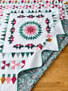 As a sampler quilt, not only does this quilt feature different blocks, it utilizes different sewing techniques. Beginning at the center, each round is comprised of panels of English paper pieced (EPP) blocks, that are then machine sewn from the center outwards to create the quilt top.