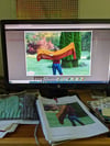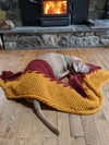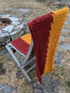 This two-colored wrap is inspired by the flames. The two sides are intertwined within the middle two-colored cable, surrounded by bramble stitch. The edges are defined by cables on each side. The wrap is knit flat, using an intarsia technique for the two colors.