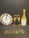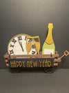 Happy New Year set for interchangable wagon includes Clockstriking midnight,bottle of champagne,,champagne glasses and a Happy New Year sign with hooks. Ranges in size from3-8" and is available painted or unpainted