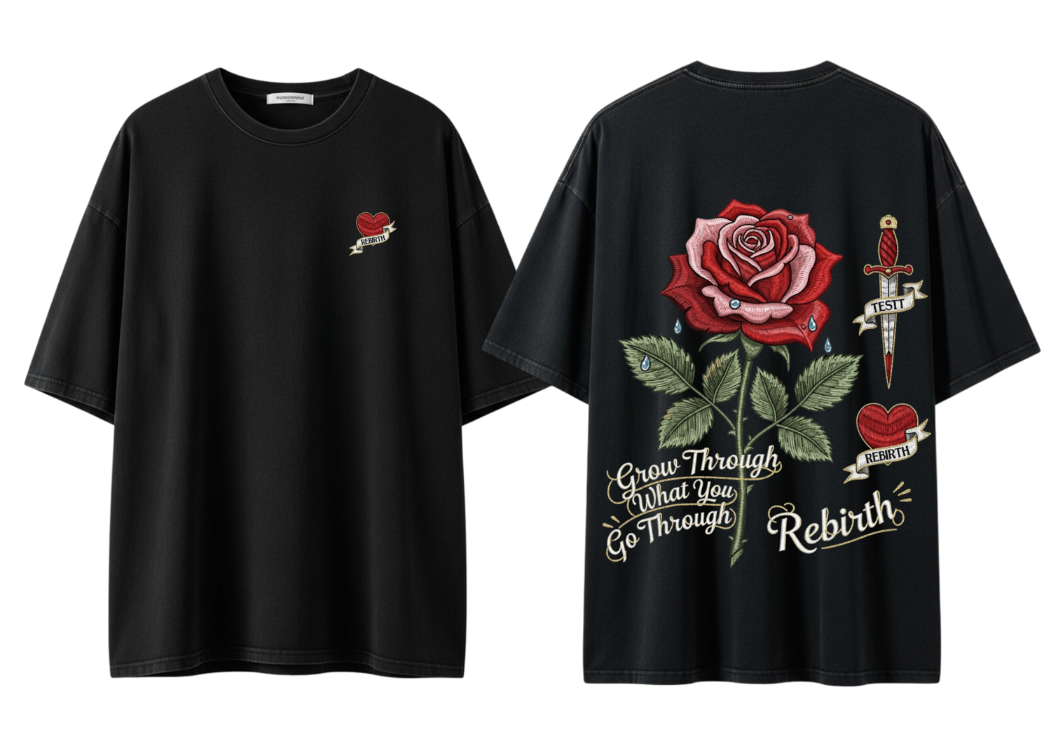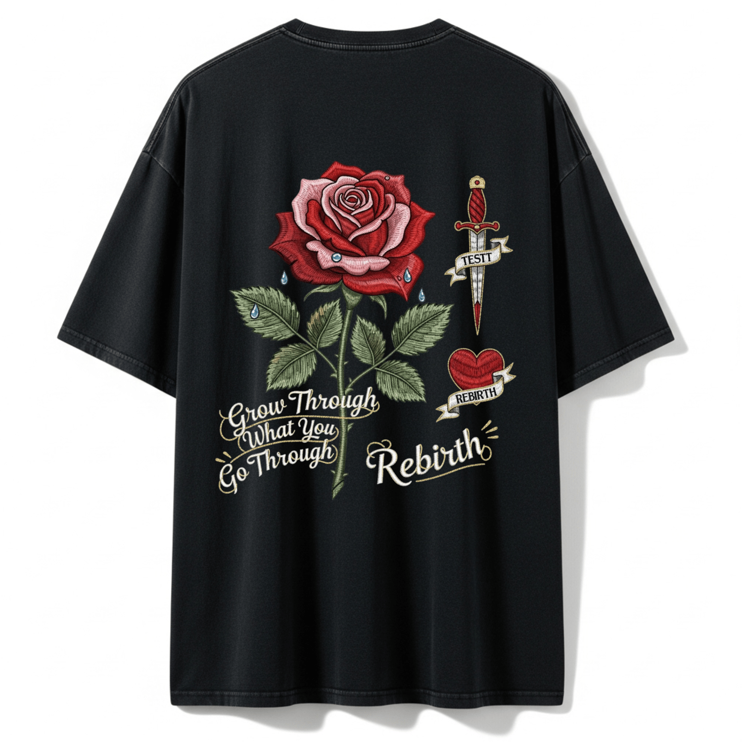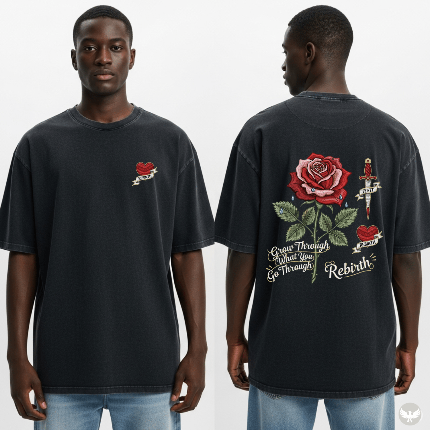 Bloom through the struggle. The Rebirth Rose Tee is a vintage-inspired piece that speaks to transformation, growth, and raw street soul. Featuring a bold embroidered rose graphic with the word Rebirth, this tee combines softness and strength in one timeless design.