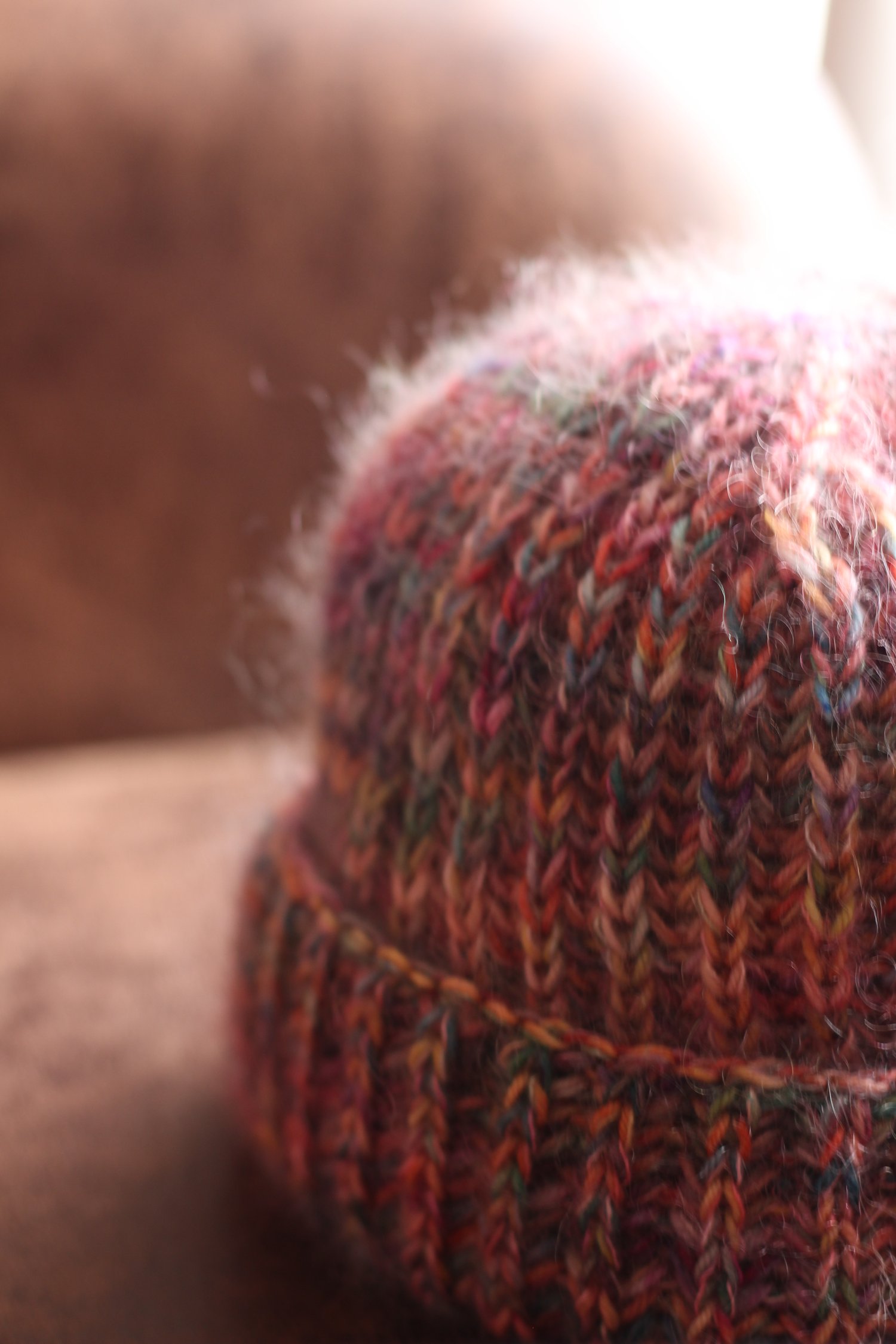 Note: the mohair blend used in the original hat is not listed above in the pattern description because it is not listed in Ravelry’s library. The original hat, which was the child’s size, used about half of each skein named in the pattern, and even the adult will still only take about half of a 100g skein of fingering weight yarn and half a 50g skein of lace weight mohair.
