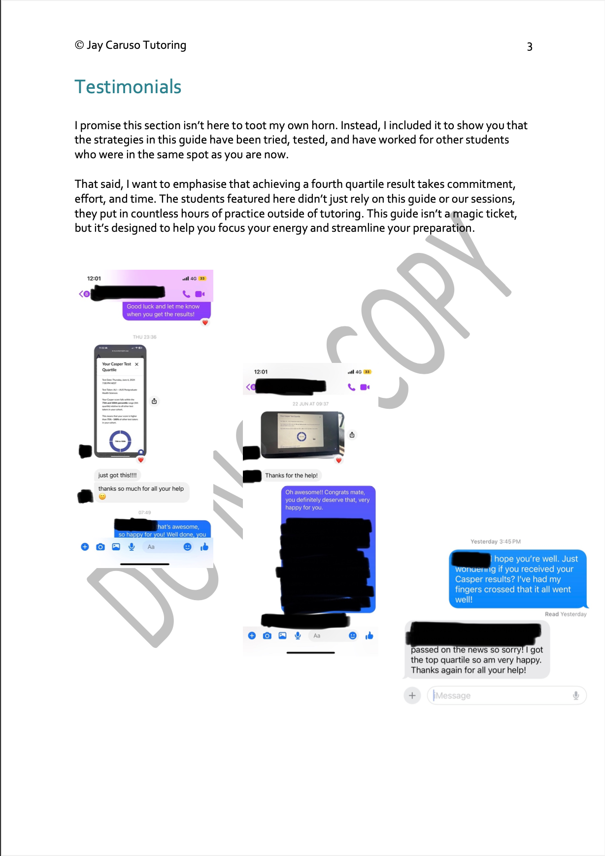 Real Experience: Insights and tips from someone who has successfully navigated the Casper process, turned a low score into top-quartile results, and tutored multiple students to do the same.