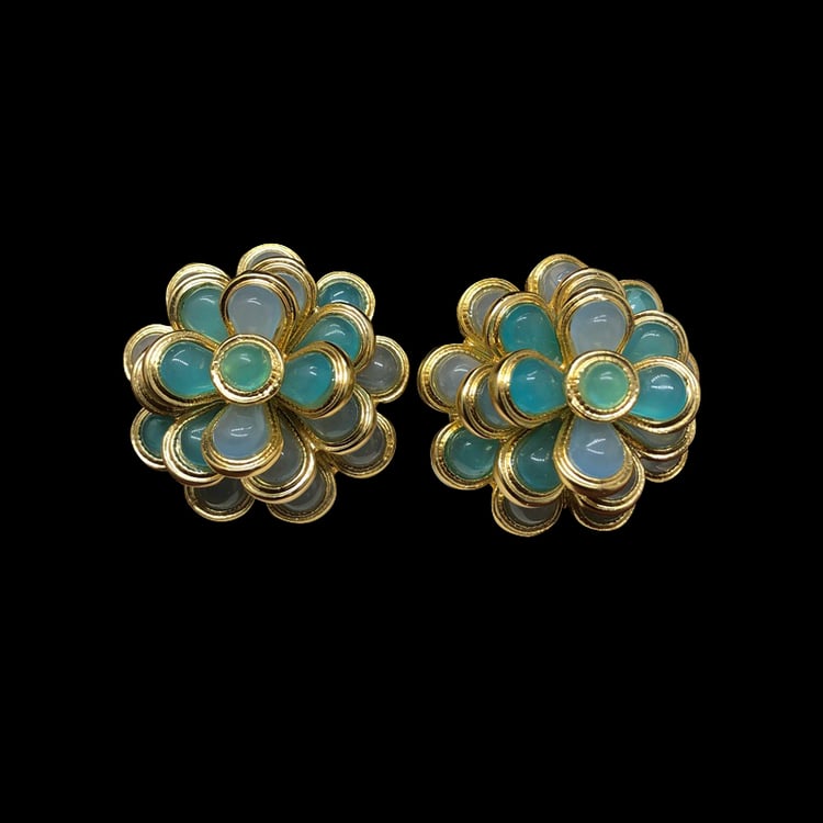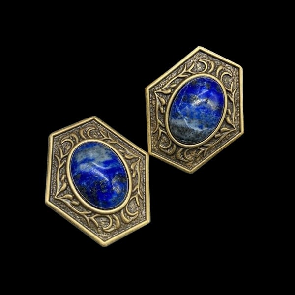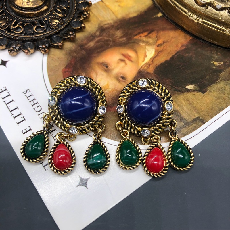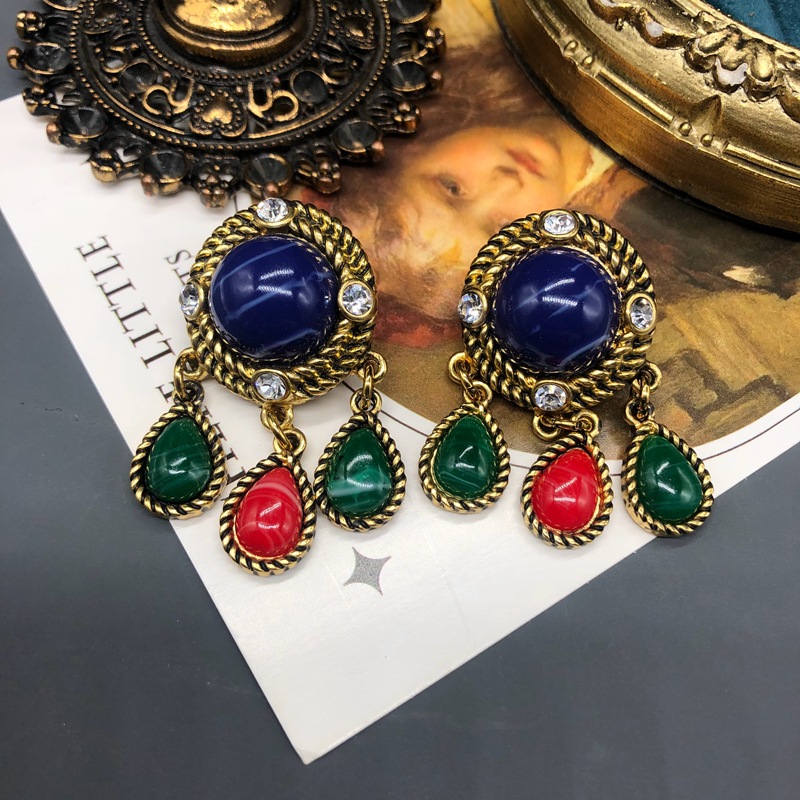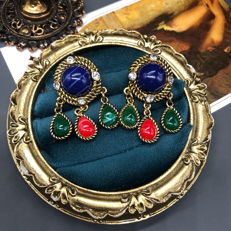 Vintage medieval court style geometric rhinestone inlay distressed gold drop earrings