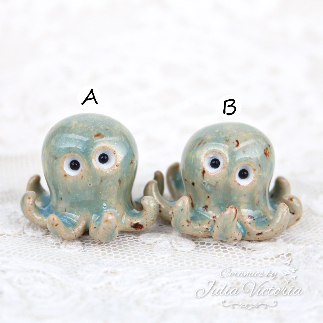 These little octopuses are looking for new homes. They are hand-sculpted in ceramics, glazed and painted by me
