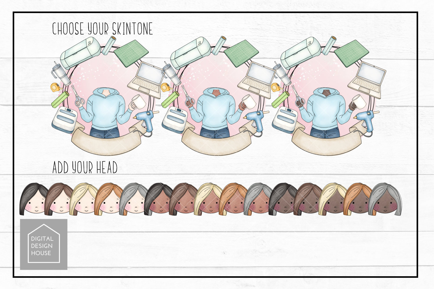 Welcome to this listing for a Female Crafter Doodle Character. Simply choose the skin colour, there are 3 options included Fair, Medium and Dark and add a head and text to personalise. There is matching clipart available separately in my shop. All suitable for sublimation and print. Thanks as always for looking.