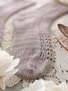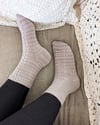 These socks are knit from the cuff down with a 1x1 twisted rib cuff. They feature a center panel of lace and cables that runs down the front and back of the sock. The heel is constructed with a classic heel flap and gusset for the snuggest and most customizable fit, and the socks end with a wedge toe.