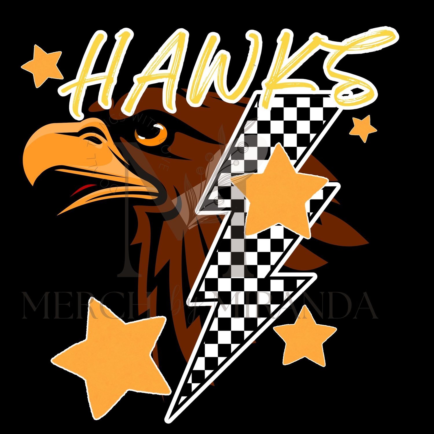 Hawks Mascot Gold | Sublimation Design | Digital Download | School Spirit Shirt PNG | DTF Design | Lightning Bolt-Checkered with Stars - Hawks
