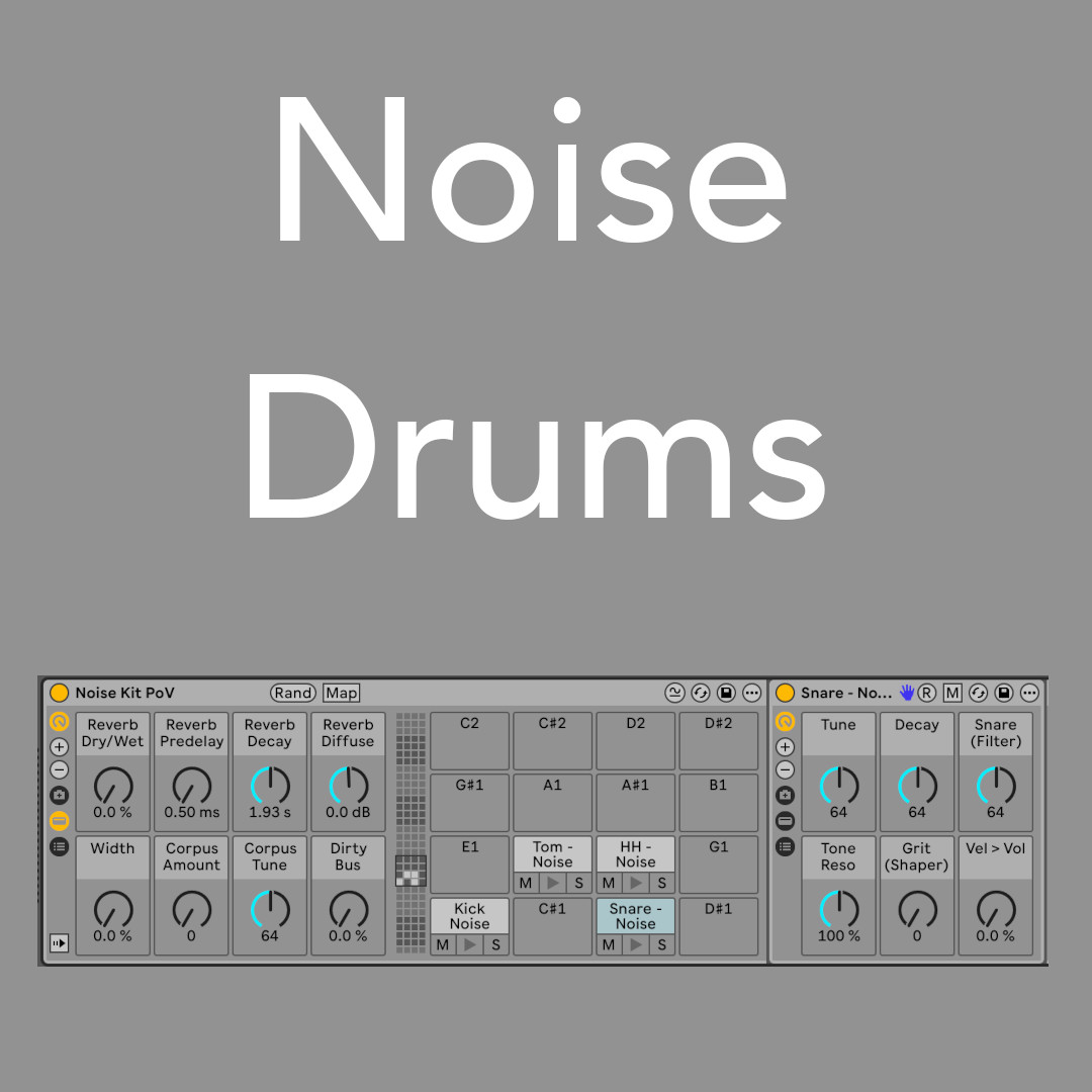 Noise Drums uses heavily filtered and EQed white noise to make drum sounds. There is a kick, snare, tom, and hi hat all featuring macros to adjust the sound to your liking. There is also a full kit with it's own unique macros. An updated version of Ableton Live Standard 12.2 is required for use. Watch this video for details: https://youtu.be/-Ui2J_H2YlM