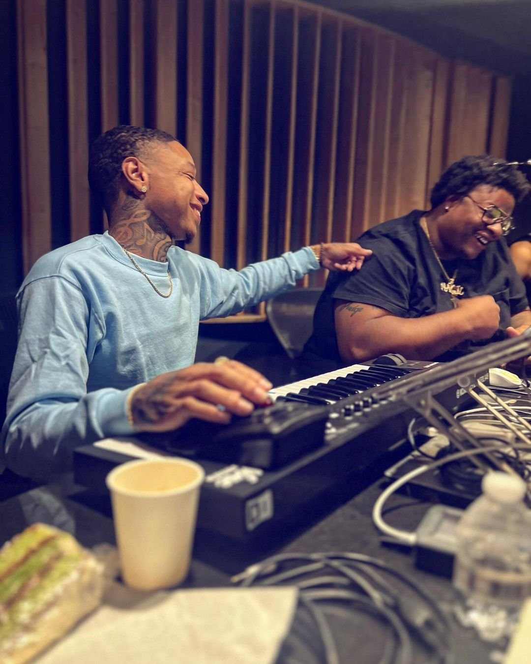 (Pictured from left to right) Mook Adams and MagicOnTheBeat share a moment at Patchwerk Studios in Atlanta, GA.