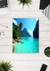 Tropical Paradise Beach Scene with Turquoise Water and Lush Mountains