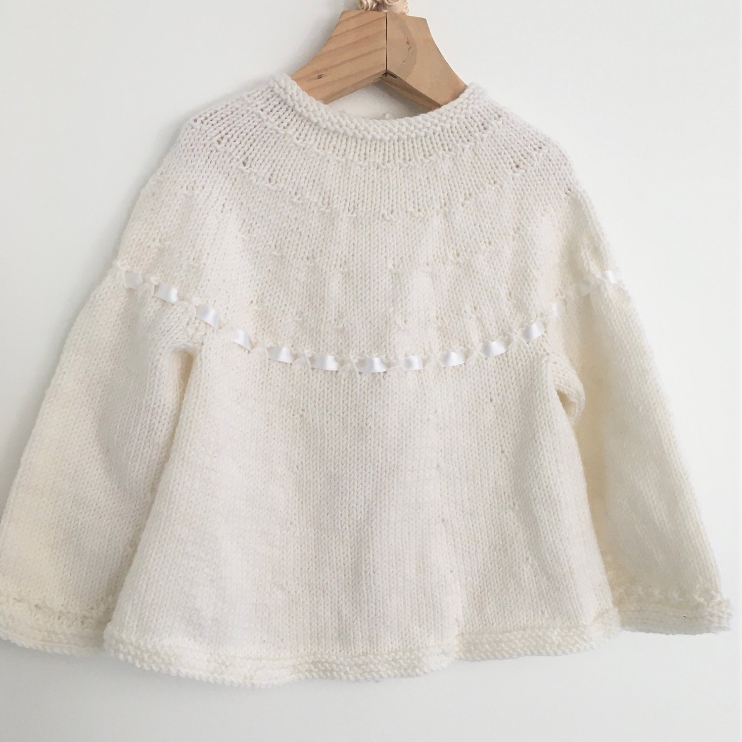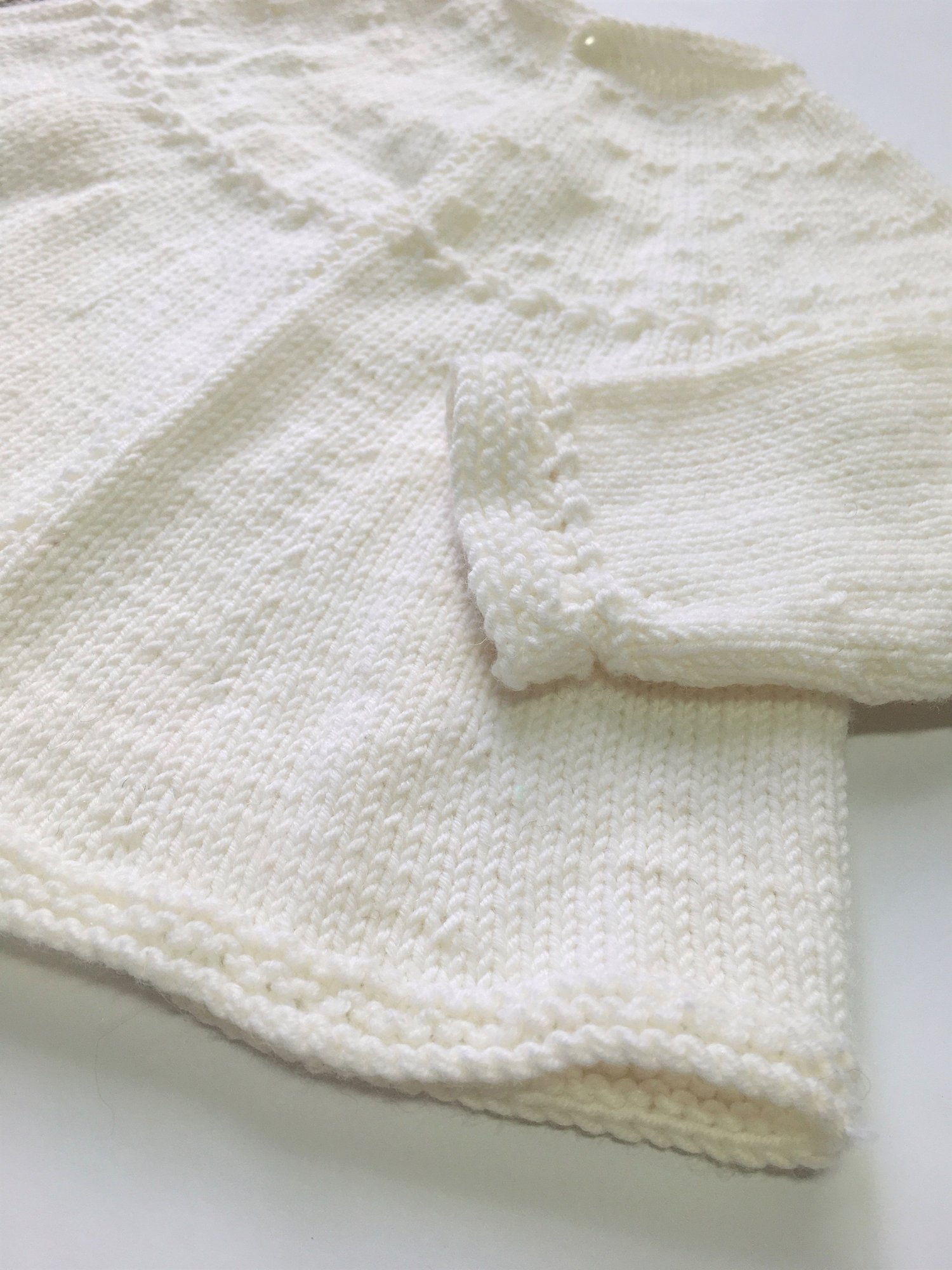 Vanilla Ice is a delicate yoked baby cardigan that is knitted seamlessly from the top down, with A-line shaping and integrated garter stitch bands. A subtle textured stitch incorporates the yoke increasing and both the yoke and sleeves feature an eyelet border pattern.