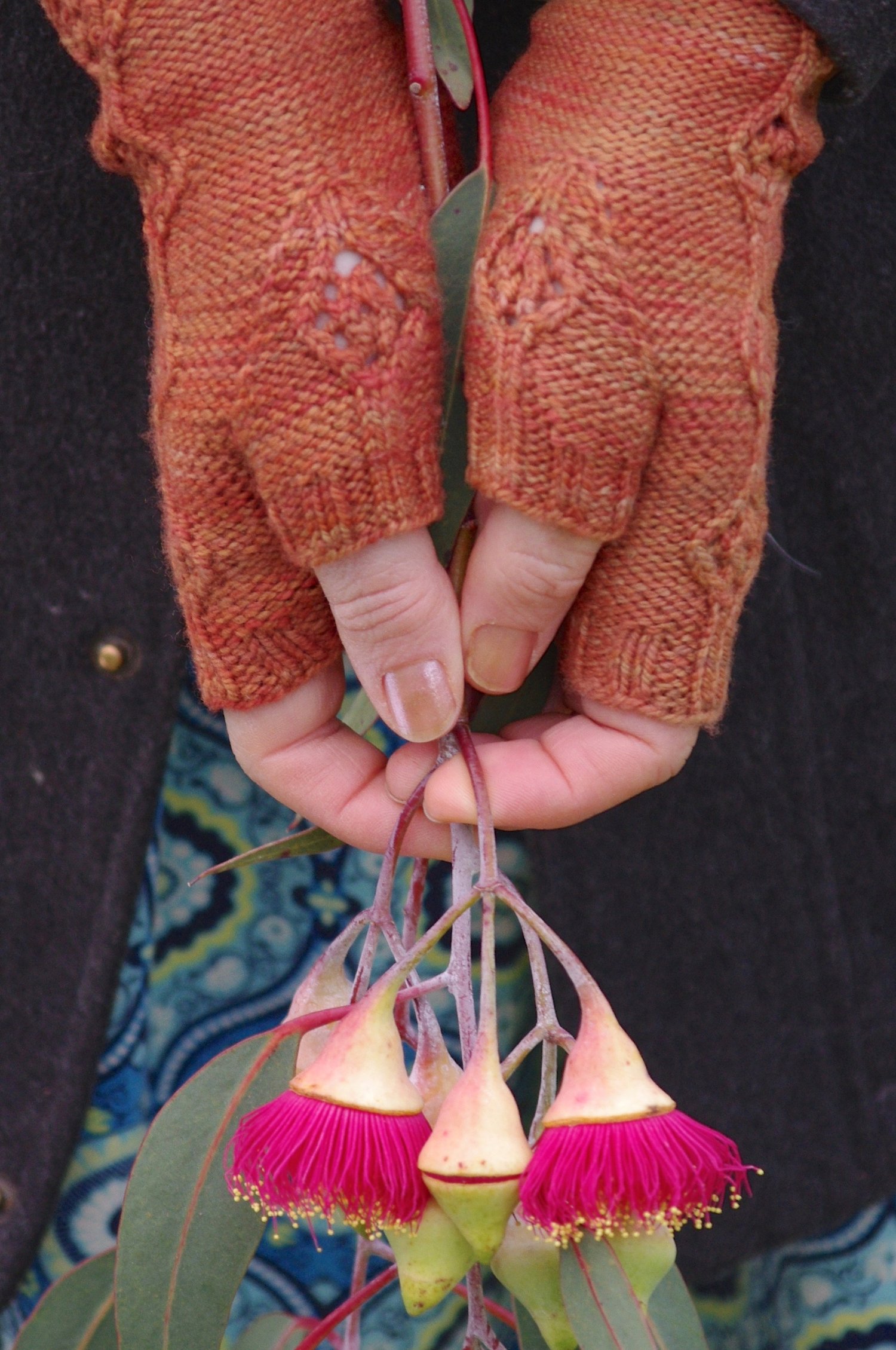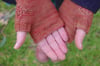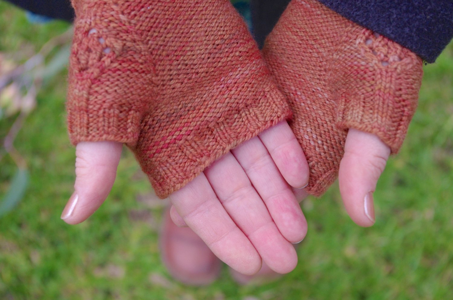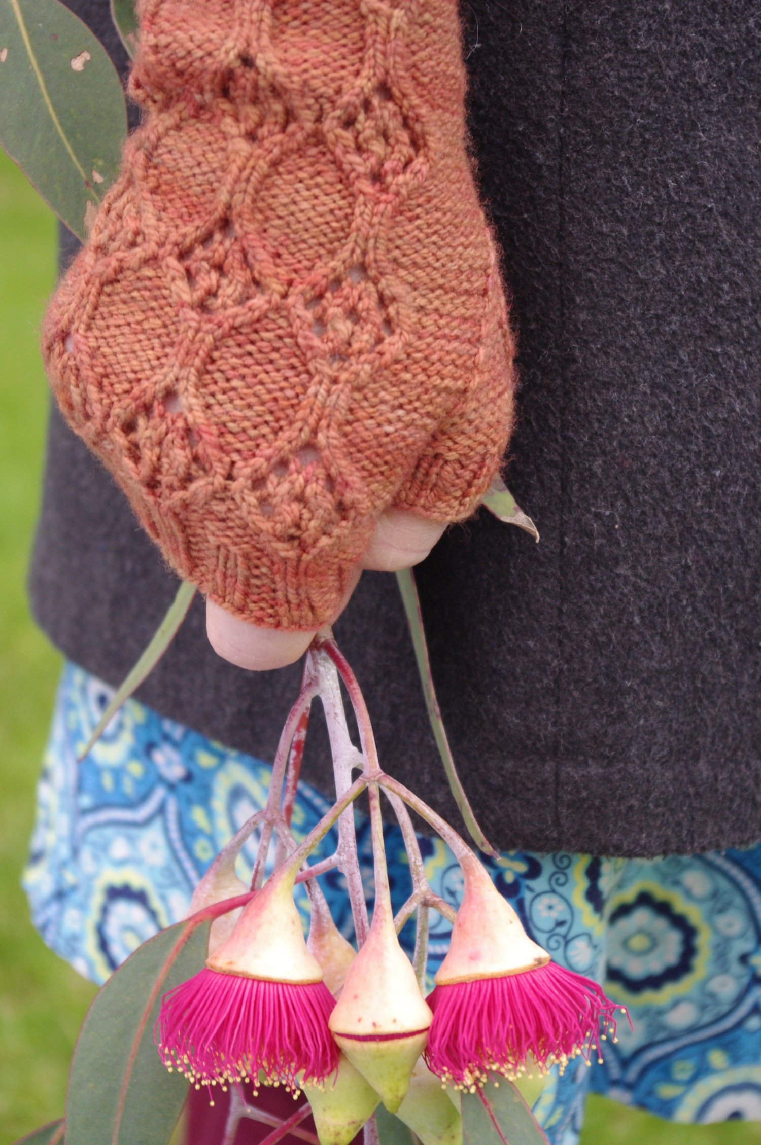 These mitts are knit in the round beginning with a 2 x2 ribbed cuff. A modified Persian lace is borne out of the ribbing and runs the length of the mitts - it is balanced out by a reverse stocking stitch base. The circular motif of the stitch pattern is repeated on the thumb gusset.