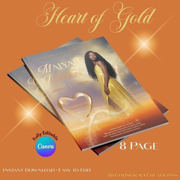 Honor your loved one with radiance and elegance using this Gold Glam Memorial Program Template, created to celebrate a life that shined brightly and left a lasting impact. This design is perfect for homegoing services, celebration of life programs, memorial tributes, and keepsake printing for family and friends.