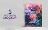5 Notebook mockups, get an excellent presentation of your notebook design in minutes, it only takes a few clicks to change the front cover, back cover, color of the metal spiral binding coils, background, background color, levels and shadows.