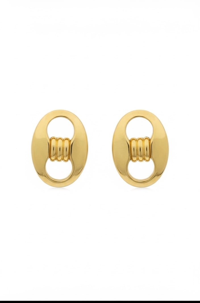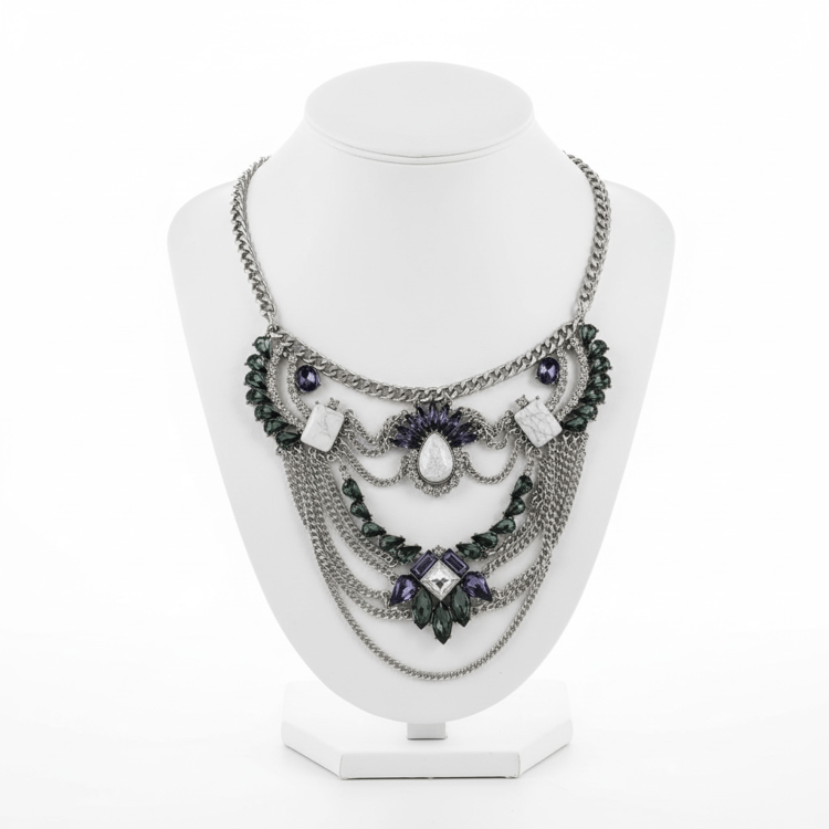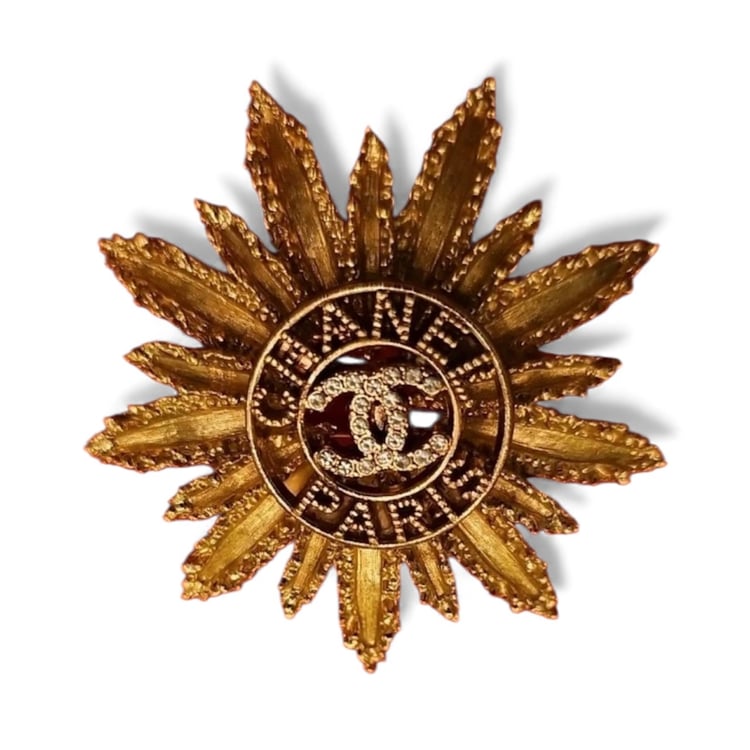 • Materials: Glass “lava rock” cabochons, navette and round rhinestones, gold-tone metal