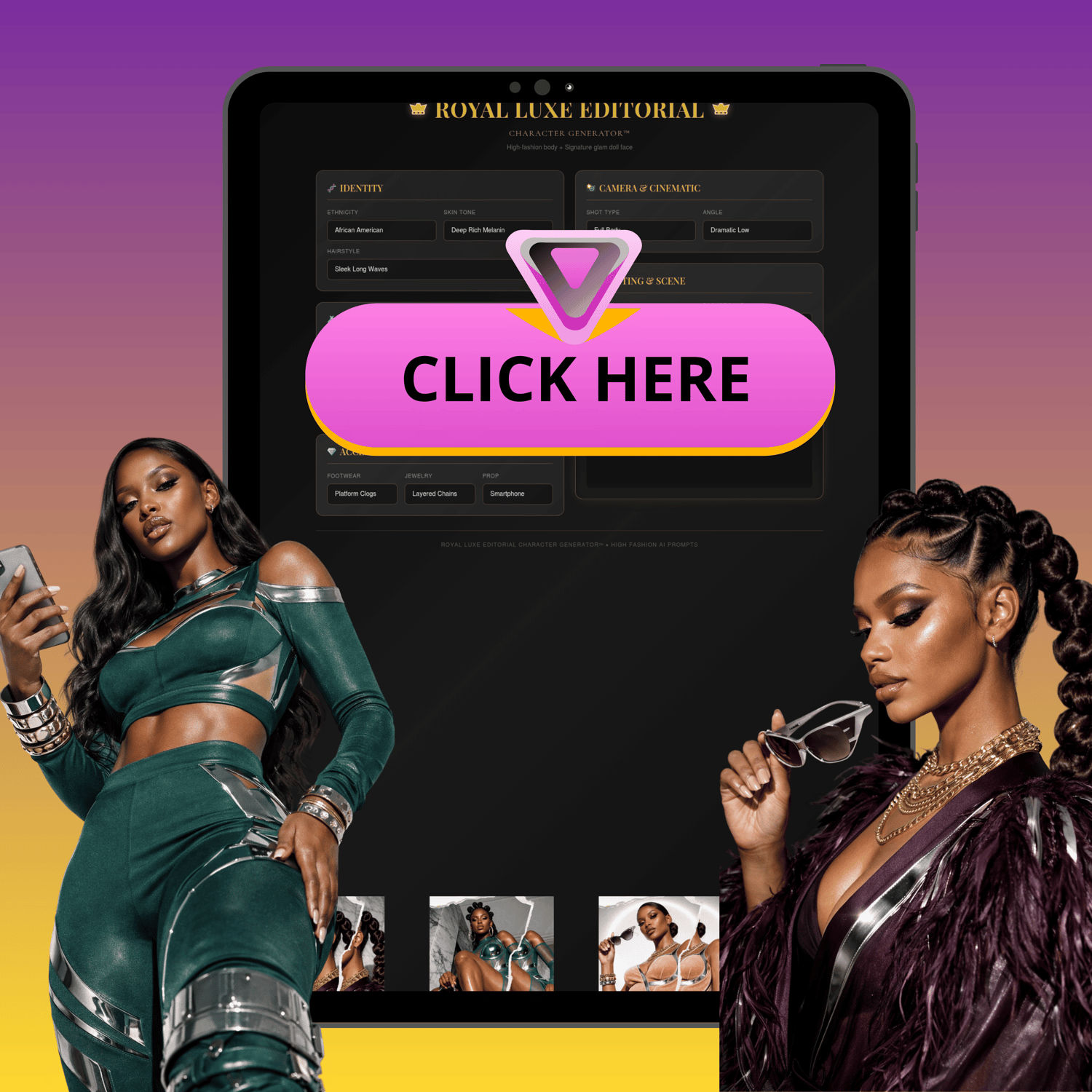 The Royal Luxe Editorialâ„¢ Prompt Builder is a high-fashion AI character generator designed to create ultra-detailed, hyper-realistic glam doll editorial campaigns with precision, consistency, and luxury-level polish.