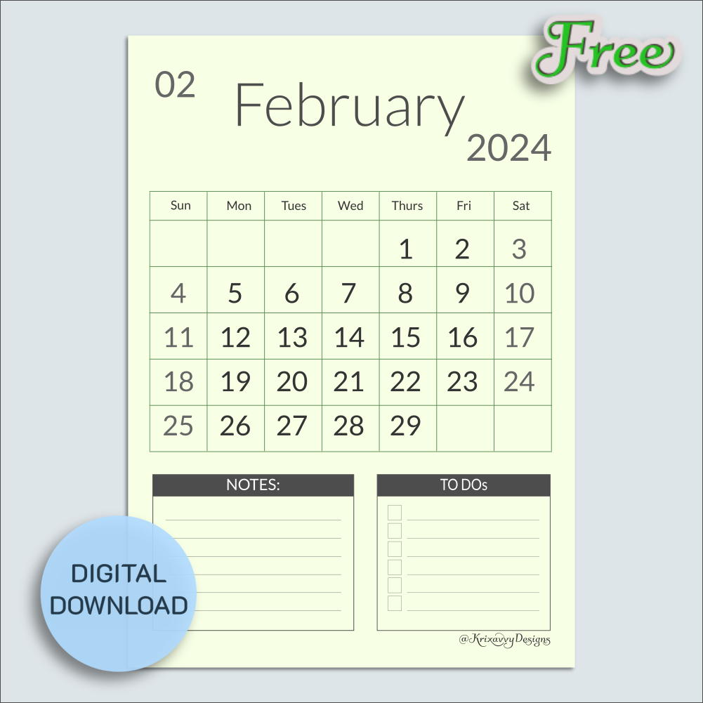 FREE Printable February 2024 Calendar | 2024 Calendar | 2024 Dated January Planner | Printable PDF | A4 Size | Monthly Planner | Big Number Display