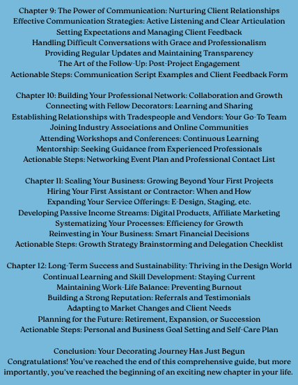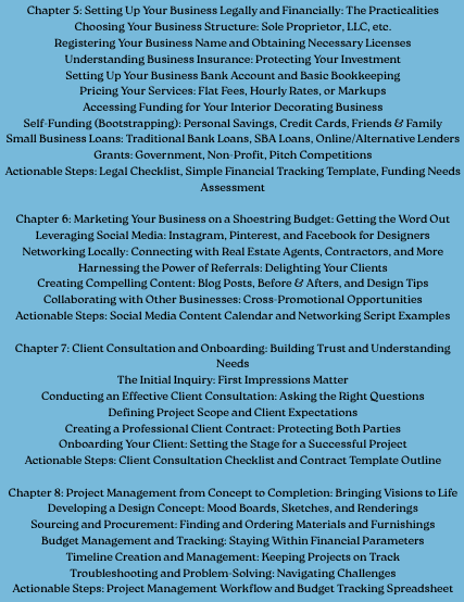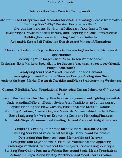Introducing "From Vision to Venture: The Complete Playbook for Interior Decorating Entrepreneurs" – your definitive guide to launching, growing, and scaling your interior decorating business, even if you're starting with zero experience.