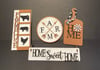 Farmhouse set for interchangable wagon includes : Farmhouse sign,cutting board home sign, pallet weathervane sign,Home Sweet Home sign with 2 hooks. Farmhouse set is laser cut from Baltic birch and hand painted. Pieces range in size from 3-8"