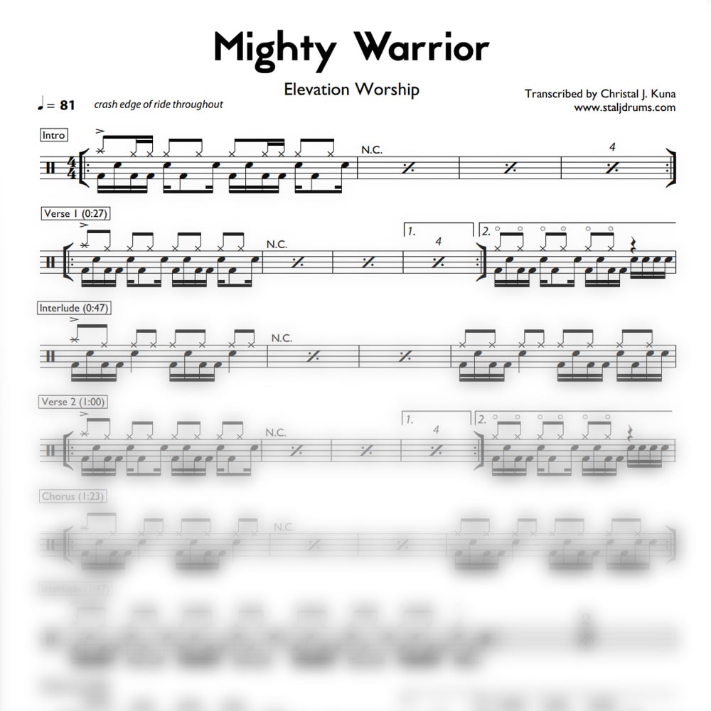 Drum sheet music for Mighty Warrior by Elevation Worship with timestamps and section markers.