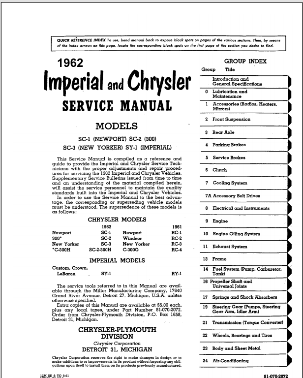 1962 Chrysler Imperial Service Manual Part No. 81-070-2072