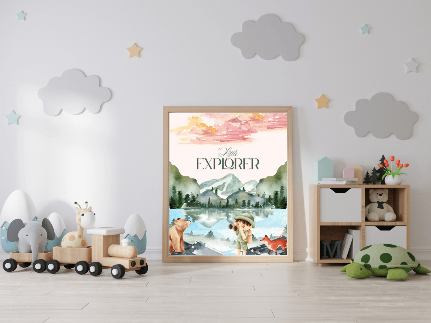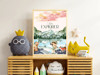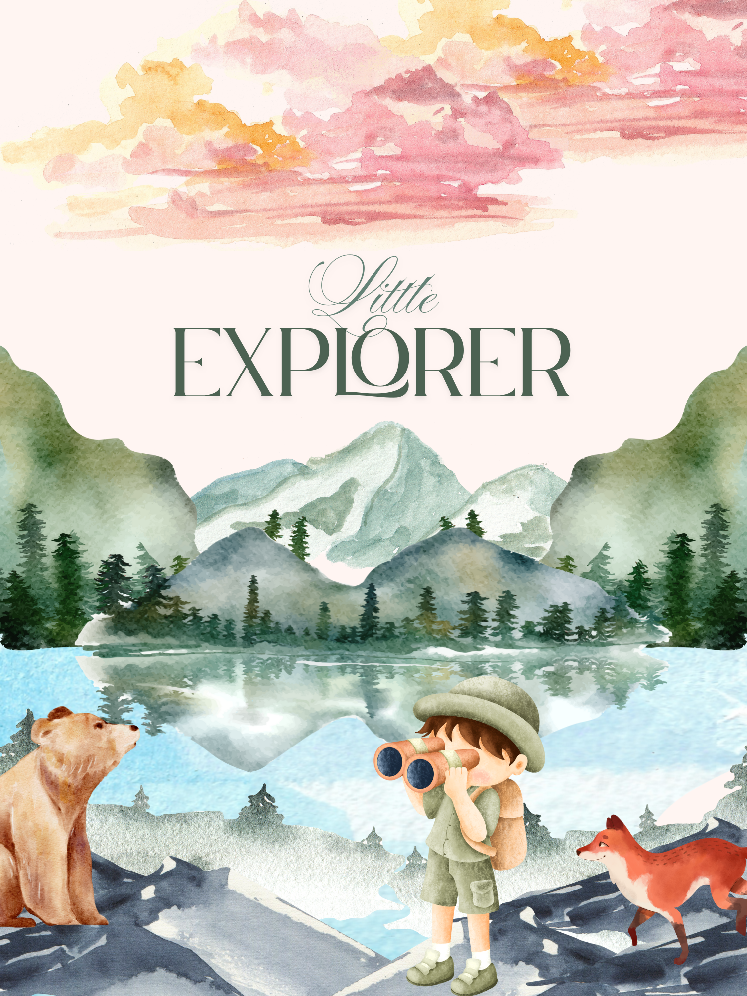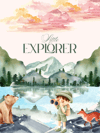 Mountains, animals, and a child in an explorer outfit — full of curiosity and watercolor wonder..