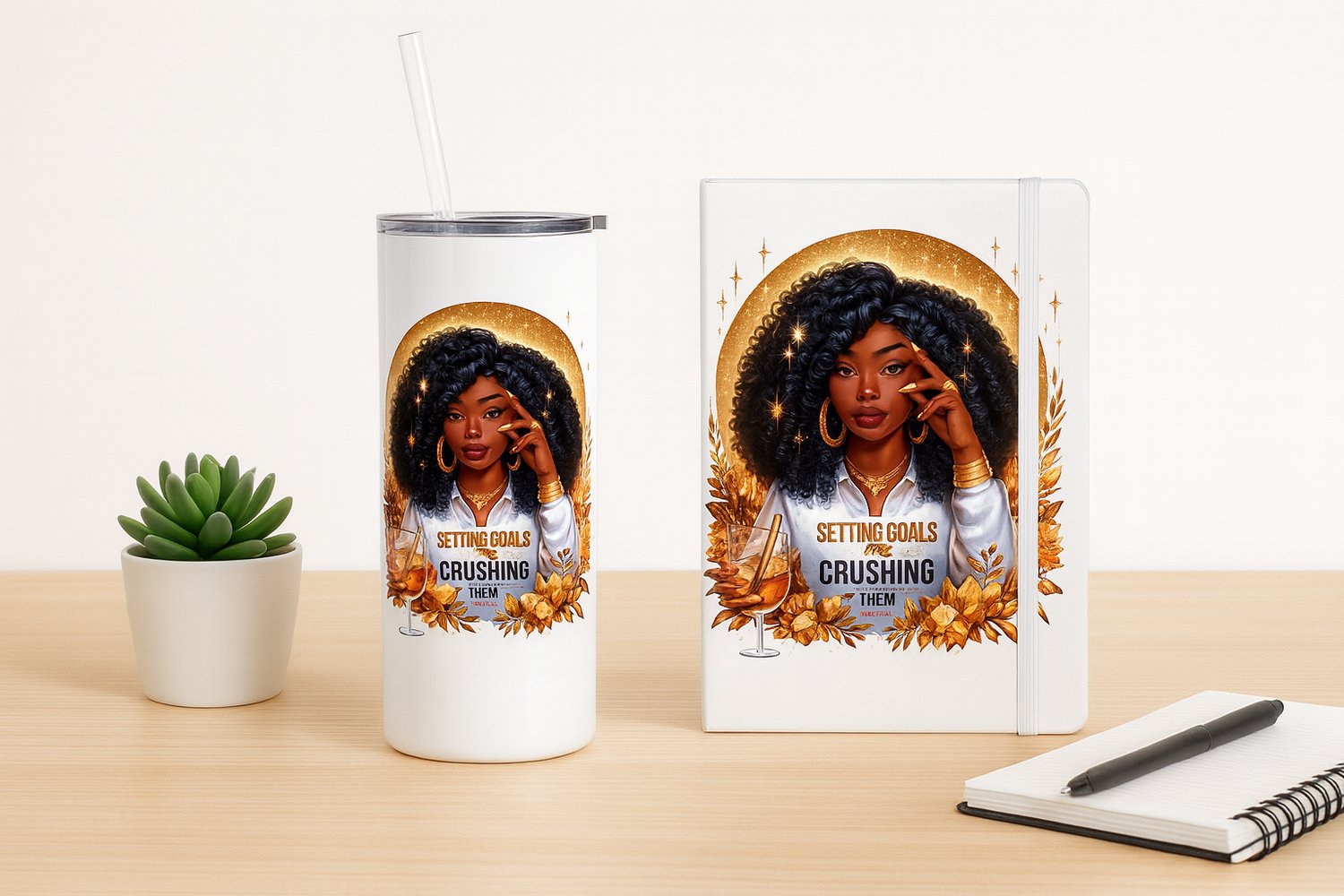 Bring your ideas to life with this versatile UV DTF print, designed to work beautifully on both A5 journals and 20oz tumblers.
