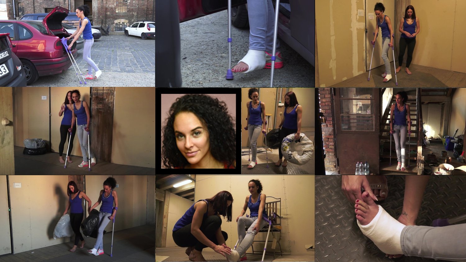 (English) After her recent accident on the stairs Elena is at home at her desk with her casted leg propped us, sole facing camera, and wearing sheer hose over her cast (that the fiberglass has already partially shredded) as well as a cast sock to keep her long toes warm. On her good foot she wears a heel. On the phone she tells a colleague she is waiting for someone to come for an interview to be her new assistant. Once off the phone she crutches to the couch wear she pulls off her cast sock to wiggle and massage her still hosed toes (long scene). When the potential assistant knocks she answers the door and they proceed to her desk where Elena she props her casted hosed cast leg up again and proceeds with the off-camera interview. At the end she asks the potential assistant for her cast sock so she can better cover her cold casted toes. She wears a cast sock for about half the clip at the beginning and end, and just her hosed toes for the other half. Nice closeups and POV shots throughout in this one.