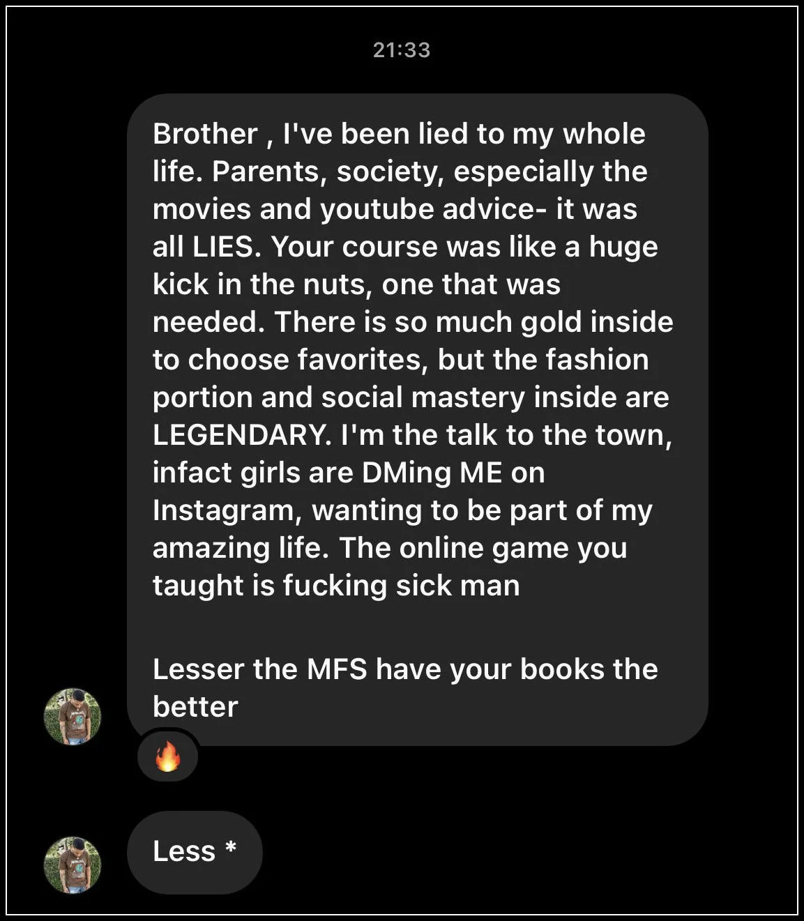 I keep hearing the other pages say things like, "I used to be a simp , but I changed my life, so if you get this course you will get 900 babes ,"