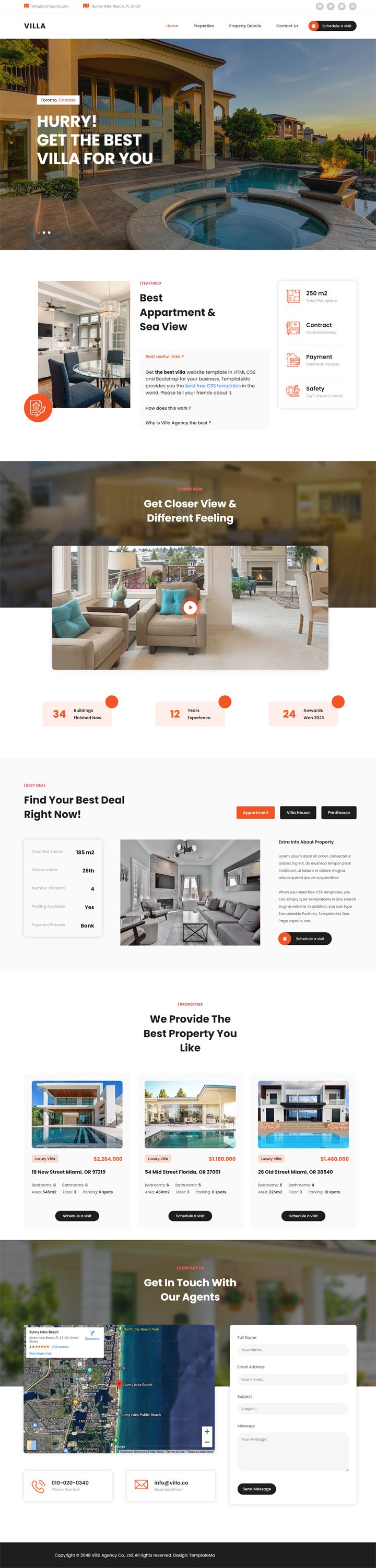 Villa Agency is a professional HTML CSS template with Bootstrap v5.3.0 responsive framework. There are Property Listing page and Property Detail page. Property Listing categorized different properties by apartment, villa house, and penthouse. Contact page includes simple contact form with name, email, subject, and message text fields. Google Maps section can be easily edited for your own location map point.
