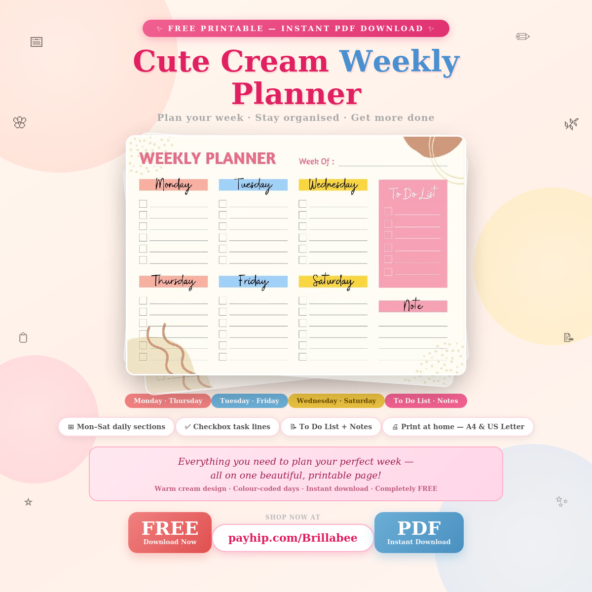 Stay organised in style with this free printable weekly planner! 🌸