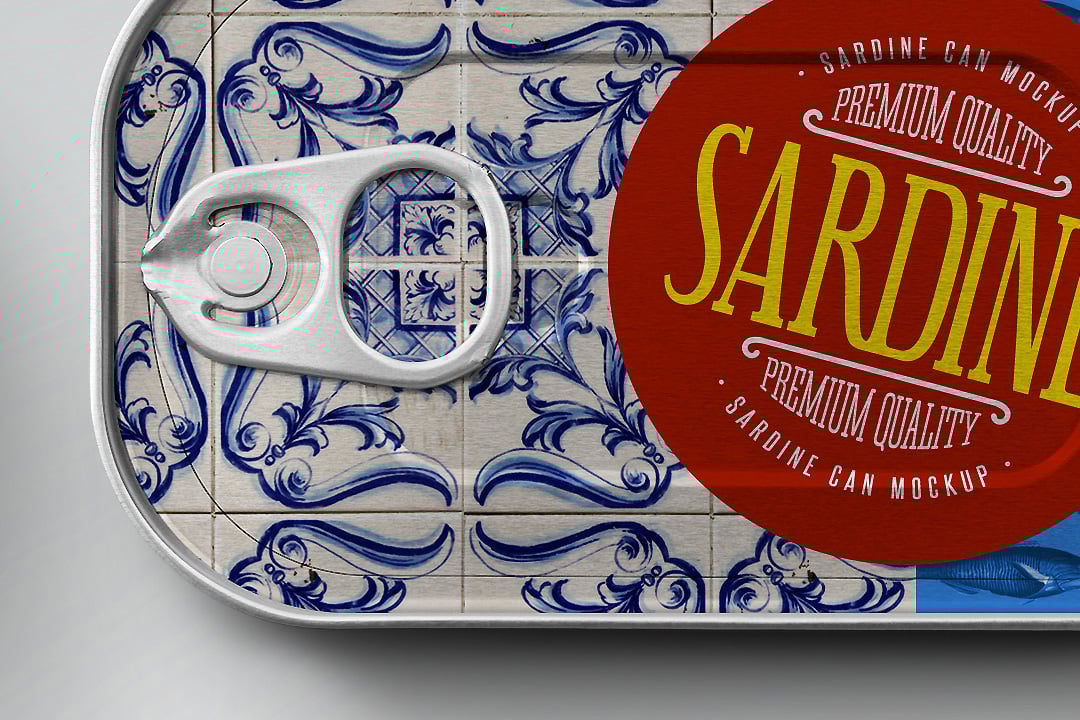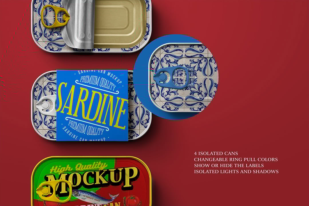 Photorealistic flat-lay mockup pack featuring 4 isolated sardine cans, perfect for showcasing food packaging or branding designs with editable Smart Objects, changeable ring pull colors, and independent lights & shadows — 4300 × 3000 px at 300 DPI.