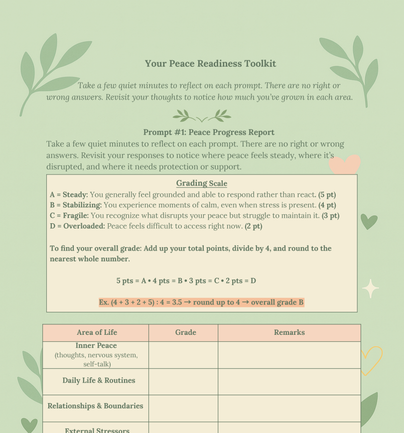 The Peace Readiness Toolkit is a thoughtfully designed, 7-page printable created to help you pause, reflect, and understand how peace shows up in your life right now—without pressure to “fix” yourself or get it right.