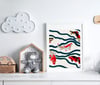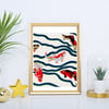 *This graphic illustration of red, black and white fish in blue strands of seawater, is perfect to light up any recreational or kid's space in your home.