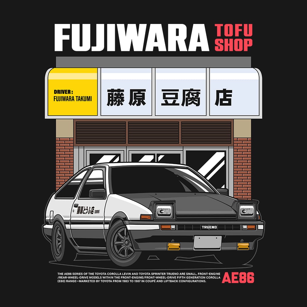 Vintage Toyota AE86 Fujiwara Tofu Shop Design – A must-have for Initial D fans! This cool, retro-style illustration features the iconic white-and-black AE86 with classic Fujiwara Tofu Shop decals. Perfect for posters, stickers, apparel, or wall art. Great for car enthusiasts, anime lovers, and JDM culture fans! Get yours now!