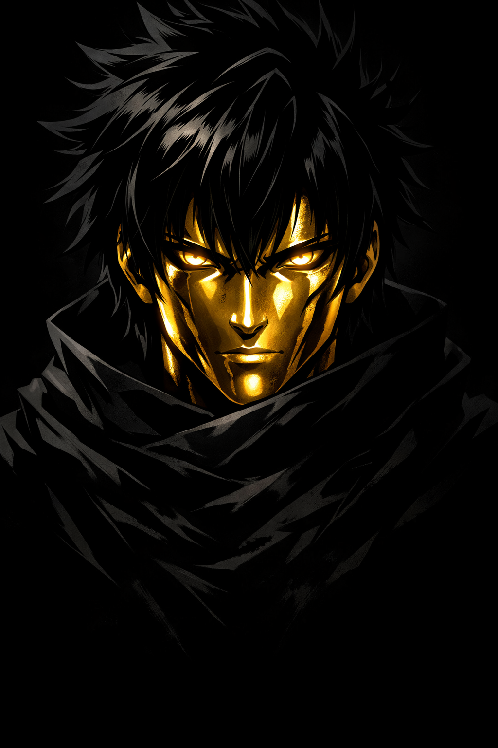 A powerful anime-inspired character emerging from complete darkness, featuring a metallic gold face and piercing glowing eyes.
