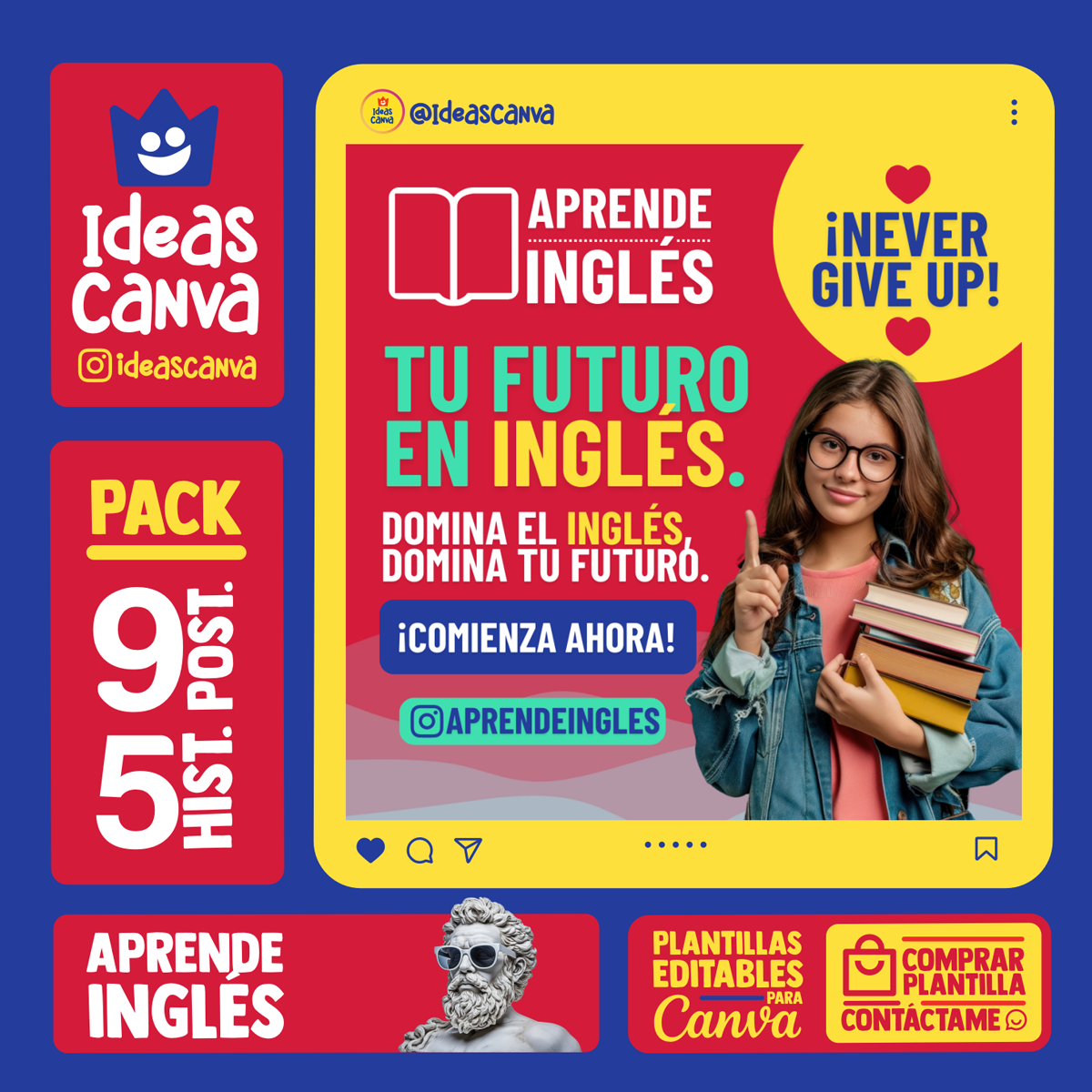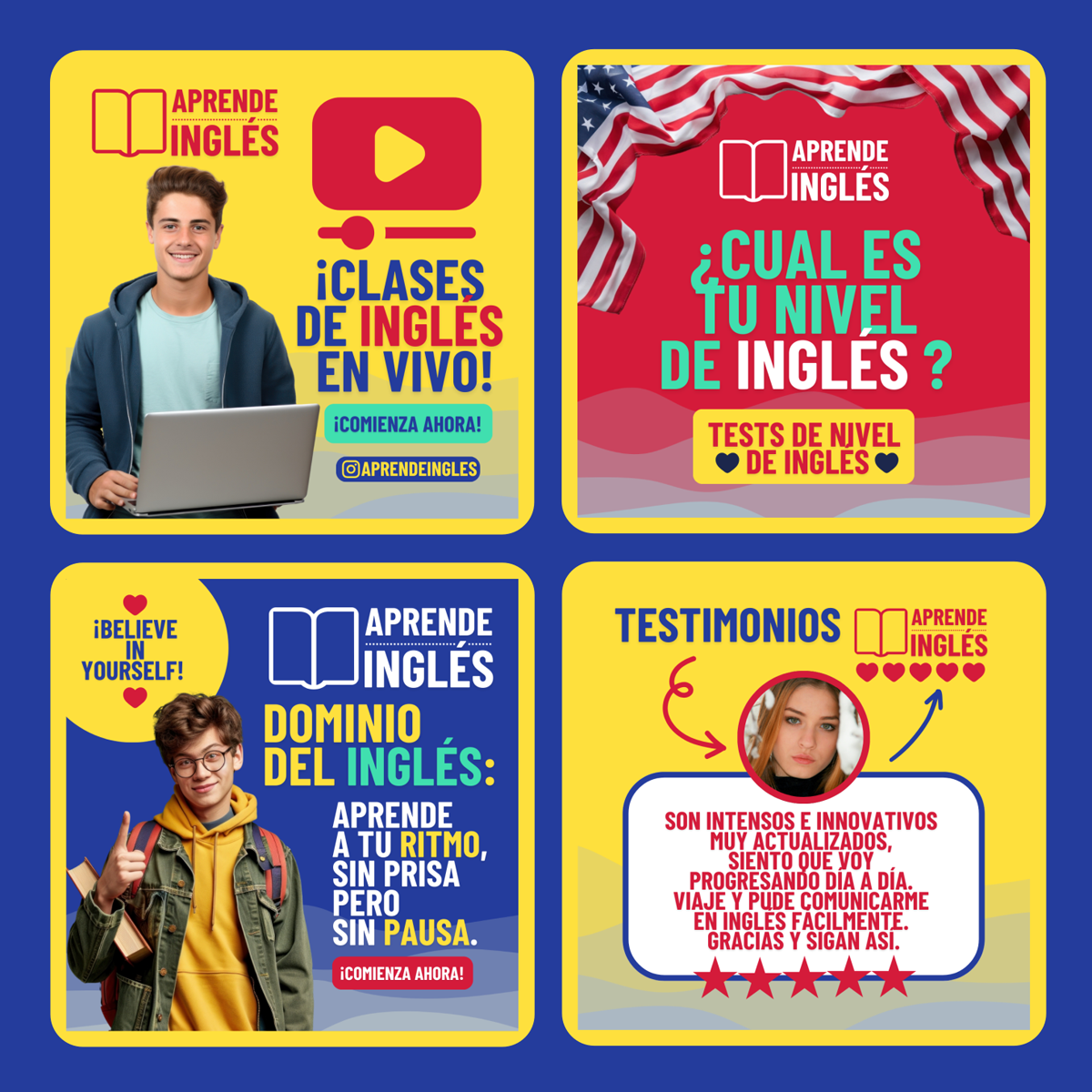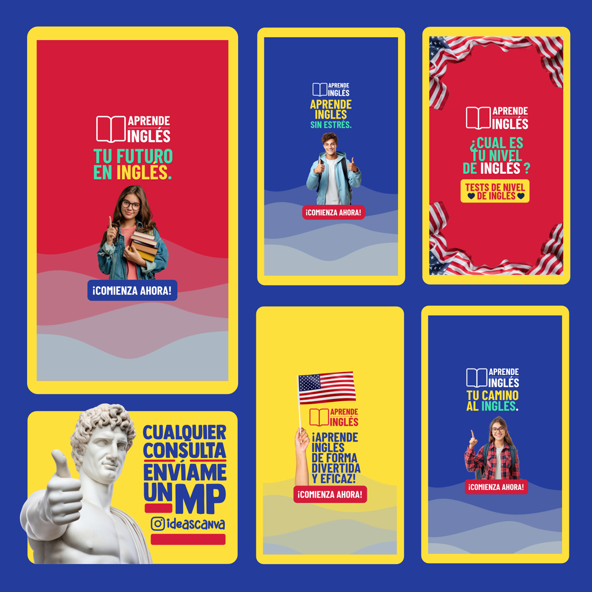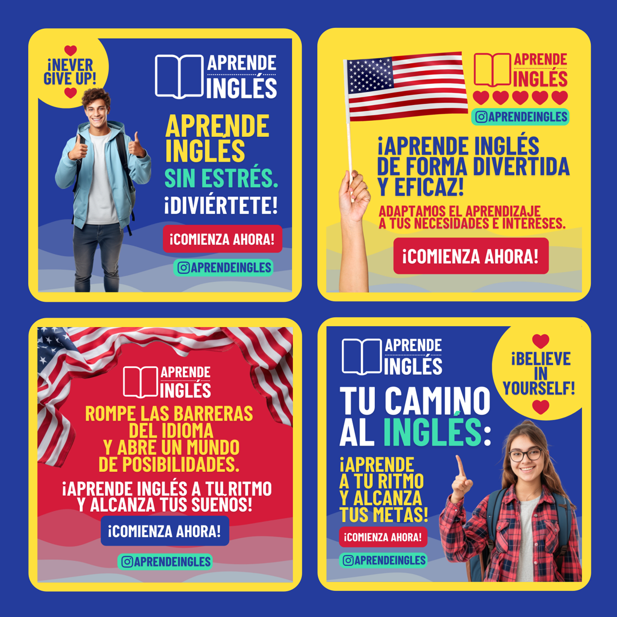 Plantilla Aprende Inglés , diseño ideal para cursos o clases de inglés / Inmobiliaria. Edita textos, colores, imágenes y elementos fácilmente adaptando estos diseños a la temática de tu emprendimiento / negocio usando nuestras plantillas para Canva.