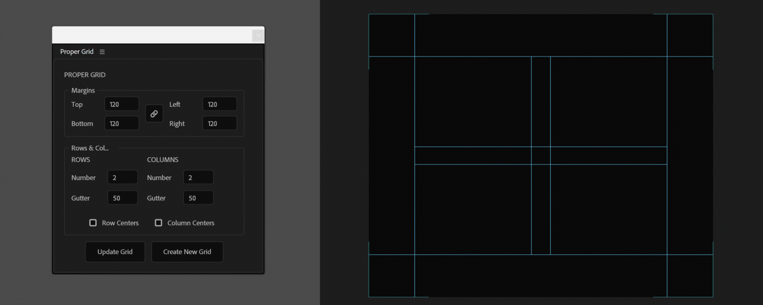Proper Grid generates precise layout systems with customizable margins, rows, columns, and gutters.