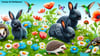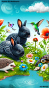 Cute patterned black baby rabbits with hedgehogs, tortoises, humming birds, ponds & flowers.