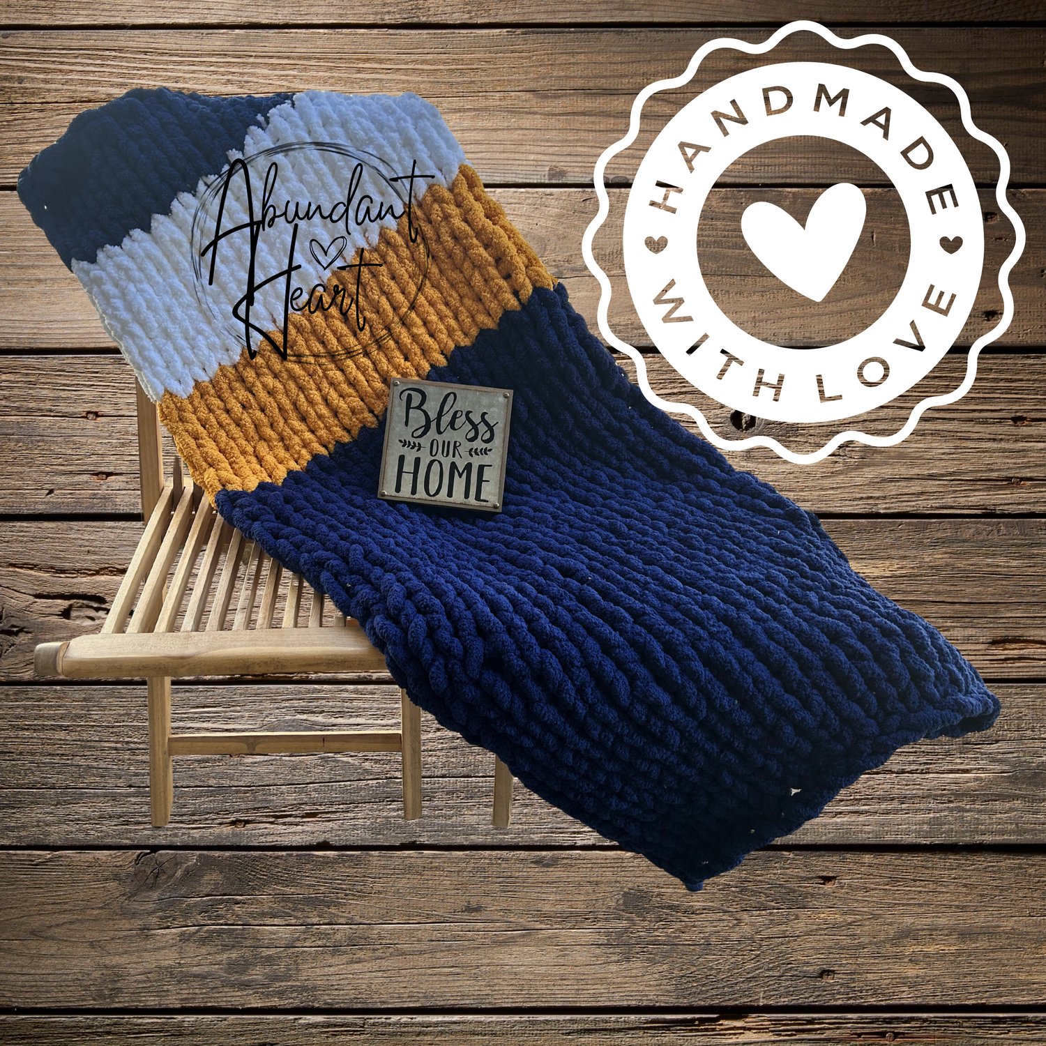 ✨ Bring home the comfort of handmade quality—add this cozy navy, white, and mustard chunky knit throw to your cart today! ✨