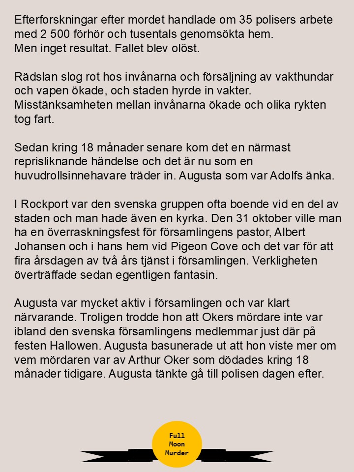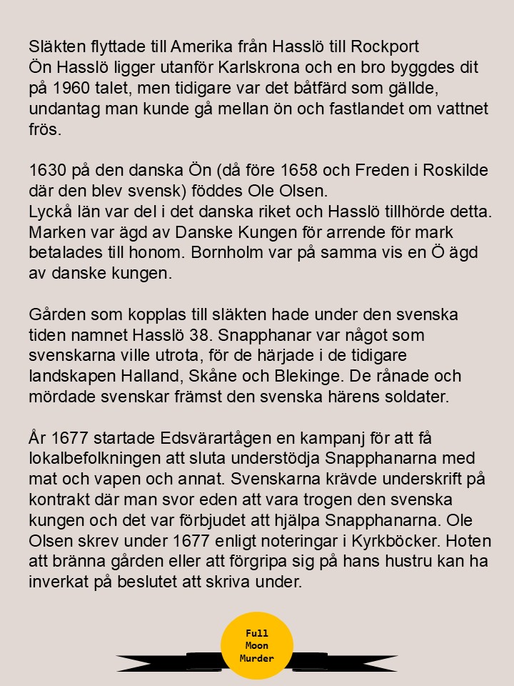 Här är en historia som kombinerar en verklig släktforskning med ett verkligt fall med två olika mord på samma ort och åren 1932 och 1933. En av de mördades hade en make som hade rötter i Sverige och på Hasslö sedan år 1630.