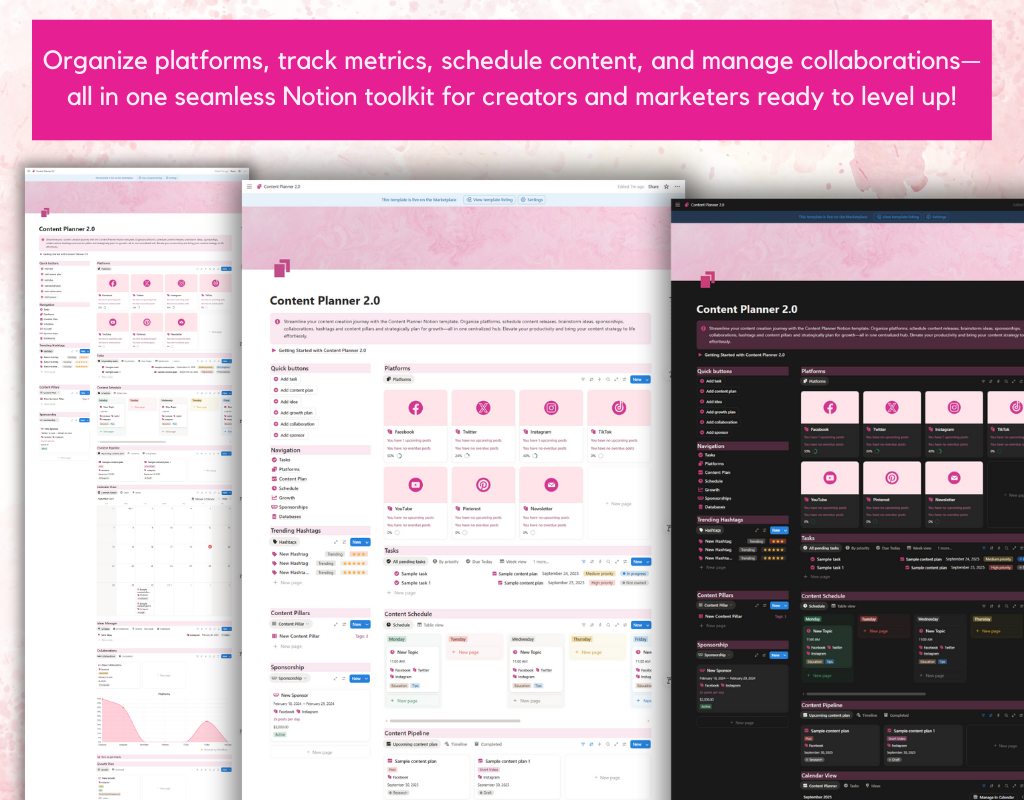 Welcome to Content Planner 2.0, the ultimate Notion template designed to elevate your content creation game. This comprehensive tool integrates seamlessly to streamline your planning process, offering a centralized hub for all your content-related needs. Whether you're a social media influencer, content creator, or digital marketer, Content Planner 2.0 empowers you to organize, strategize, and foster growth across multiple platforms.