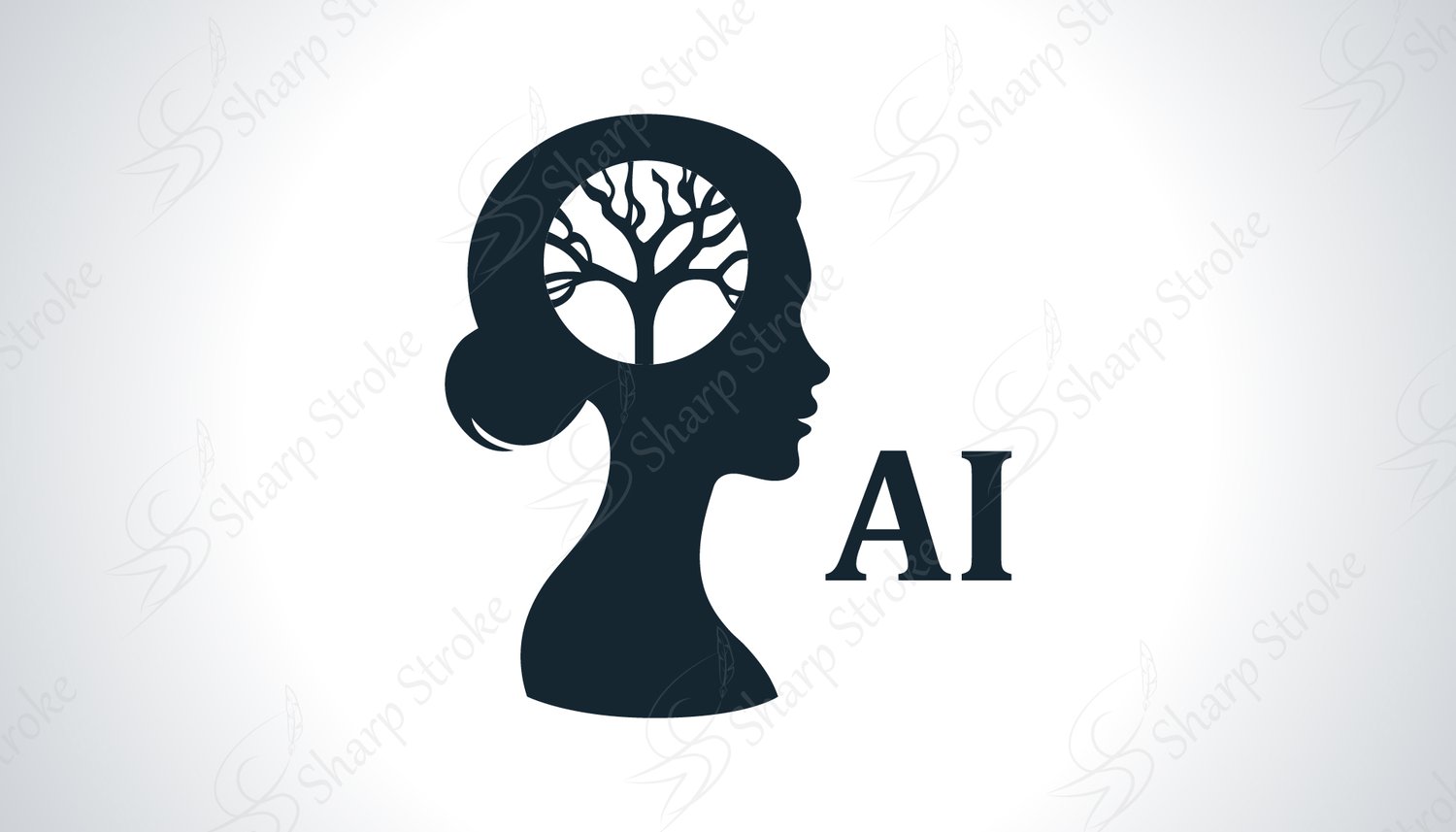 The artwork features a woman’s silhouette with a tree integrated into her head, symbolizing intellect, growth, and artificial intelligence. A graceful fusion of nature and technology for meaningful, thought-provoking projects.