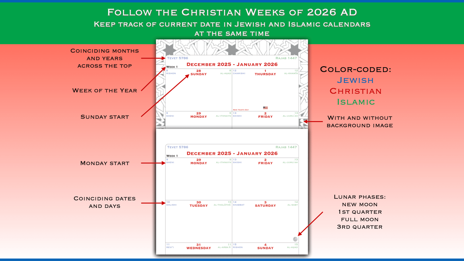 The Christian (Gregorian) calendar is used world-wide as the universal calendar for business, much like English is a universal business language. The Jewish and Islamic calendars are still in use today by members of those faiths and in certain countries. As a result, calendars combining one of these with the Gregorian calendar are readily available, but this calendar combines all three so we can all use the same one.