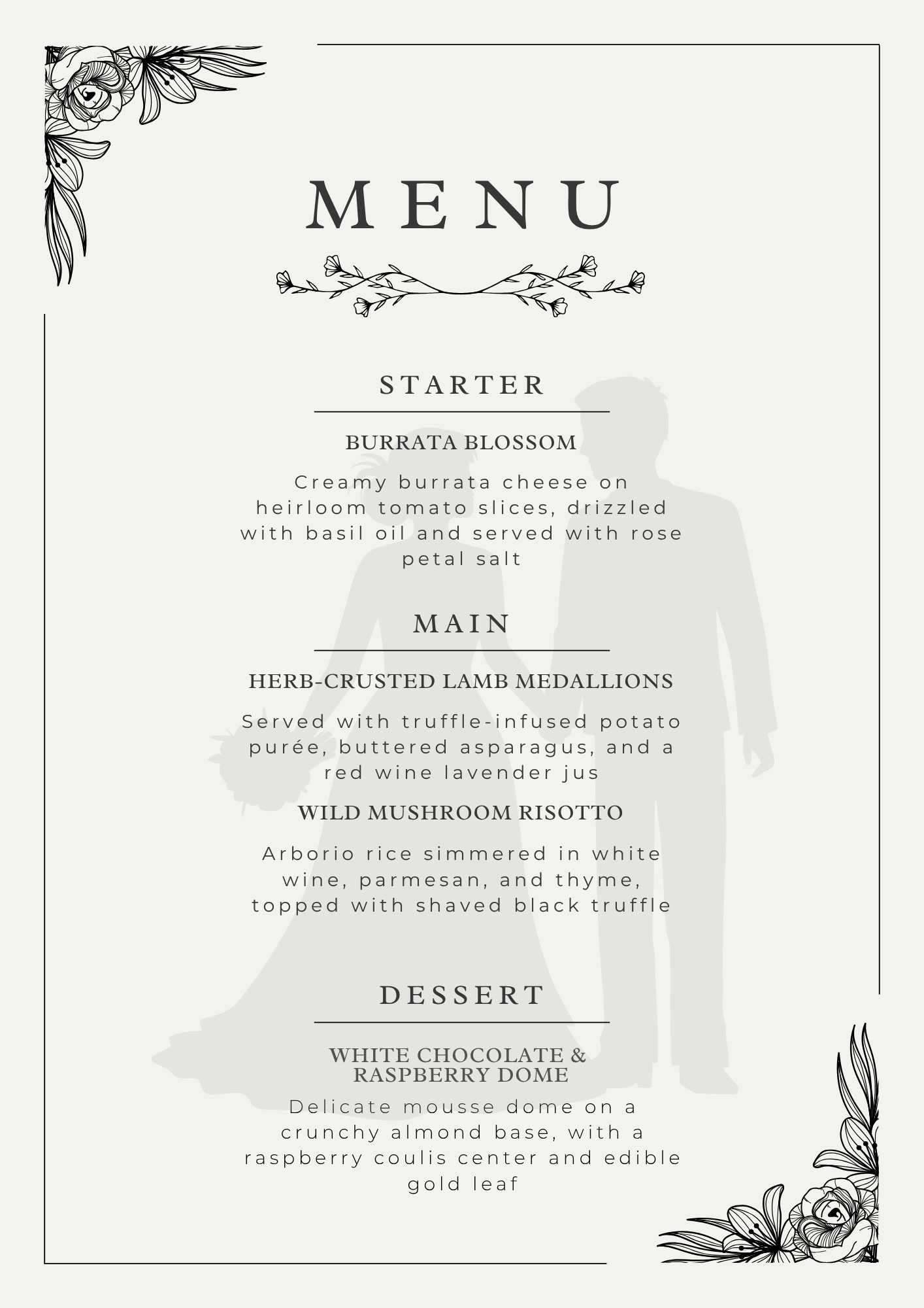 Set the tone for your celebration with the Ever After Menu – a refined and romantic wedding menu template designed to complement a timeless wedding theme.