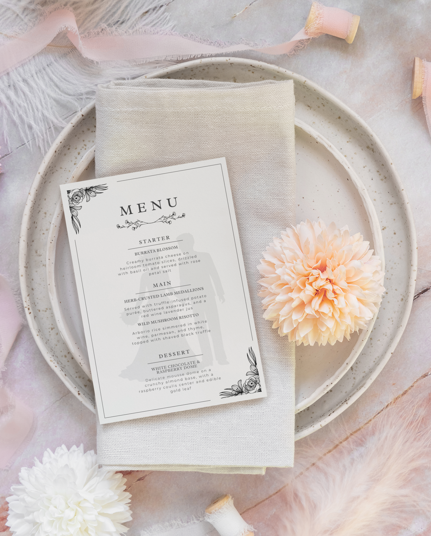 Featuring delicate hand-drawn floral elements and a subtle silhouette of a bride and groom, this design is perfect for couples who want a classic and personal touch at each place setting.