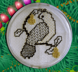 A peaceful blackwork partridge framed by two golden pears, perfect for a festive coaster, card, or keepsake gift. The pears can be worked in either cross stitch or small seed beads for a touch of sparkle.